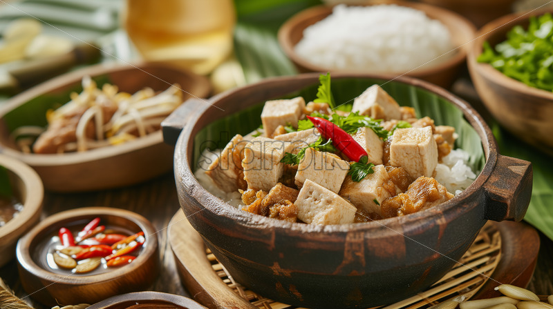 Home » Shop » Uncategorised » Filipino tofu and pork dish, professionally captured in native style, presented on a wooden bowl adorned with banana leaves, creating a harmonious blend of traditional aesthetics and culinary artistry.