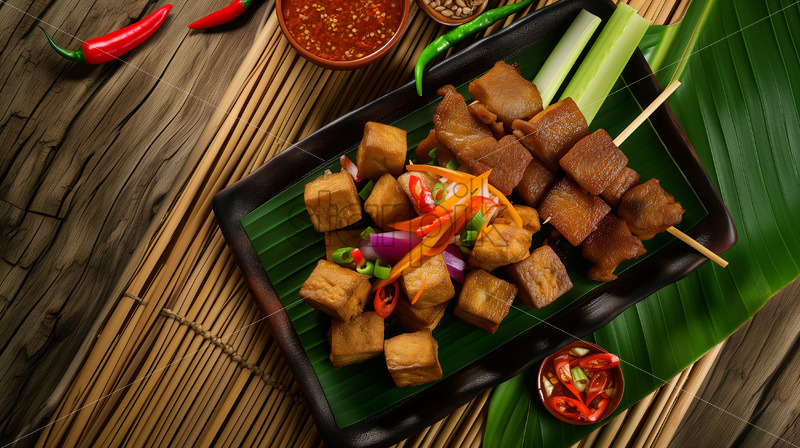 Filipino dish featuring tofu and pork is presented with finesse on a bamboo table, complemented by the authentic touch of banana leaves in a stunning display of native-style artistry