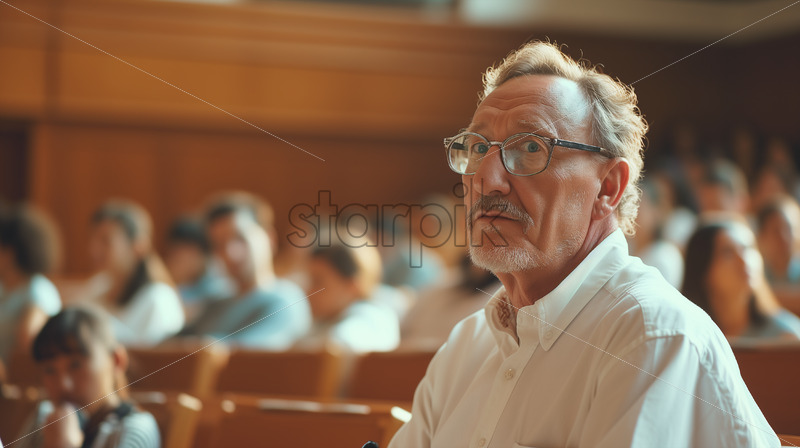 This compelling photograph captures a distinguished male professor in white attire and eyeglasses, basking in warm natural lighting. Seated with authority, the wise figure is surrounded by engaged students in the background, forming a scene of academic guidance and learning.