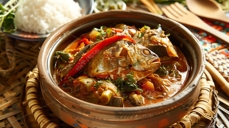 A delectable image featuring São Toméan Calulu, a rich fish and vegetable stew often made with okra and palm oil.