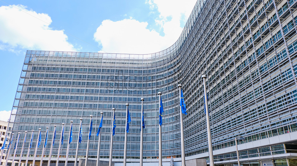 Flags of Europe in front of Berlaymont European Commision building in Brussels, Belgium
