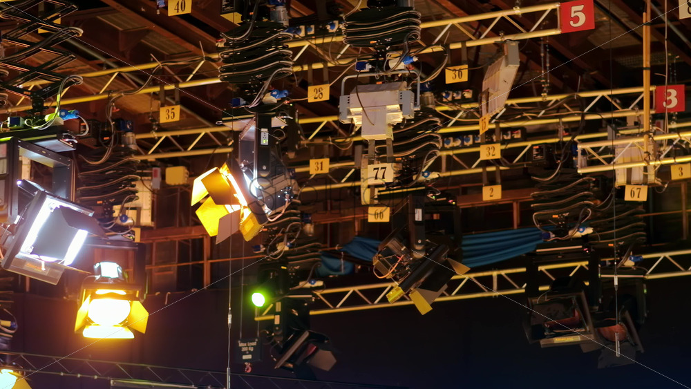 Home » Shop » 1 Video » Video – Flashing studio lights equipment on the ceiling of a TV set