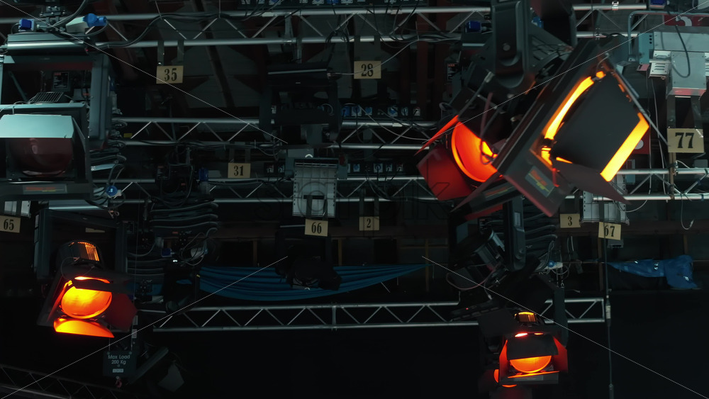 Flashing studio lights equipment on the ceiling of a TV set Royalty Free Stock Video Footage Royalty Free Stock Video Footage