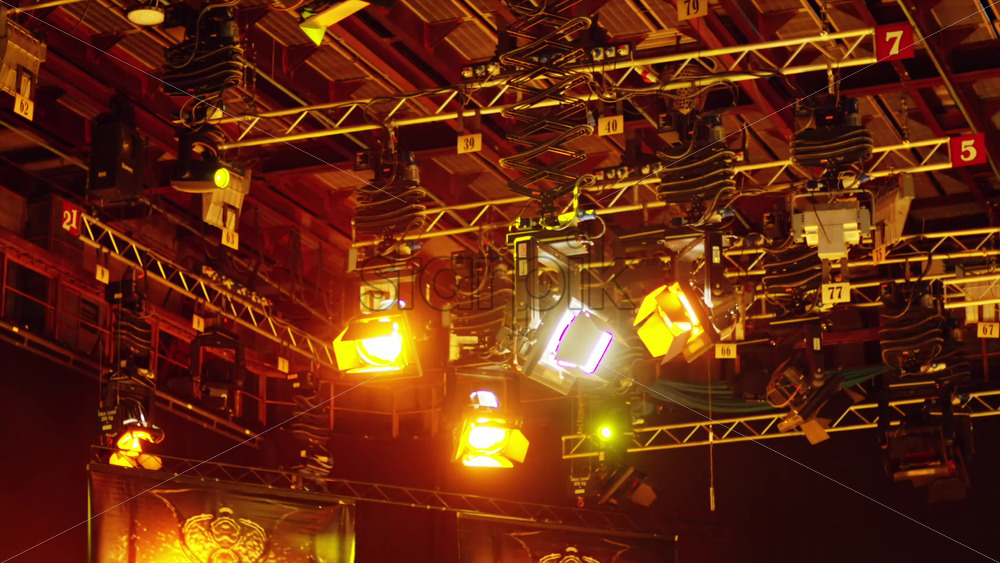 Flashing studio lights equipment on the ceiling of a TV set Royalty Free Stock Video Footage Royalty Free Stock Video Footage