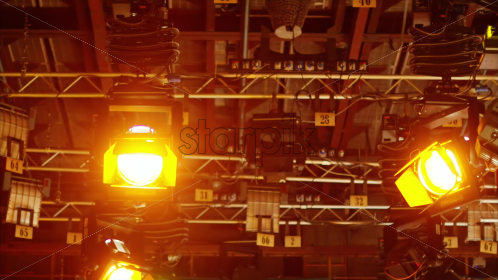 Flashing studio lights equipment on the ceiling of a TV set. Vertical Royalty Free Stock Video Footage Royalty Free Stock Video Footage