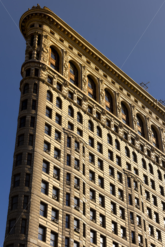 Close view of the Flatiron Building facade in New York downtown, USA