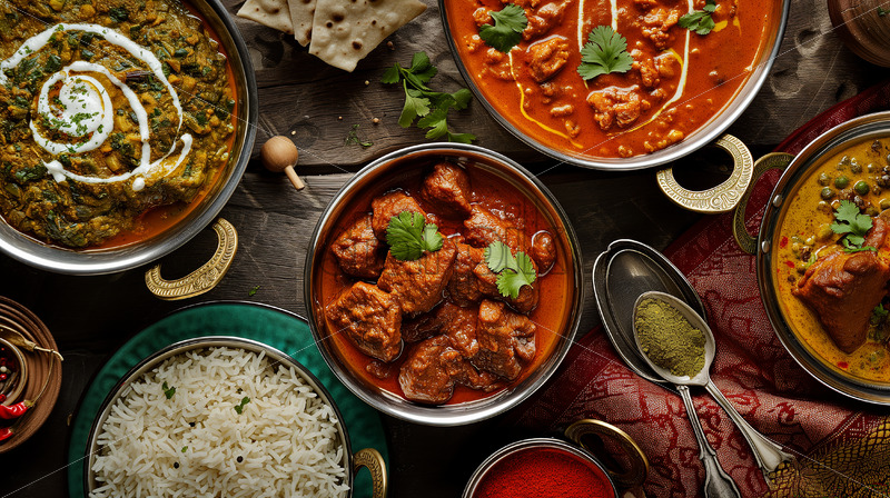 An enticing photograph capturing the rich and flavorful world of Indian curry, featuring a variety of dishes with meat or vegetables cooked in a spiced sauce. The delectable curries are artfully arranged in a bowl or on a plate, garnished with cilantro or a swirl of yogurt. The scene is set in either a traditional Indian dining room or a vibrant street food market, illuminated by warm, soft light that highlights the dish’s vibrant colors. Traditional Indian elements, including brass utensils, an array of aromatic spices, and colorful fabrics, contribute to the cultural richness of the culinary experience.