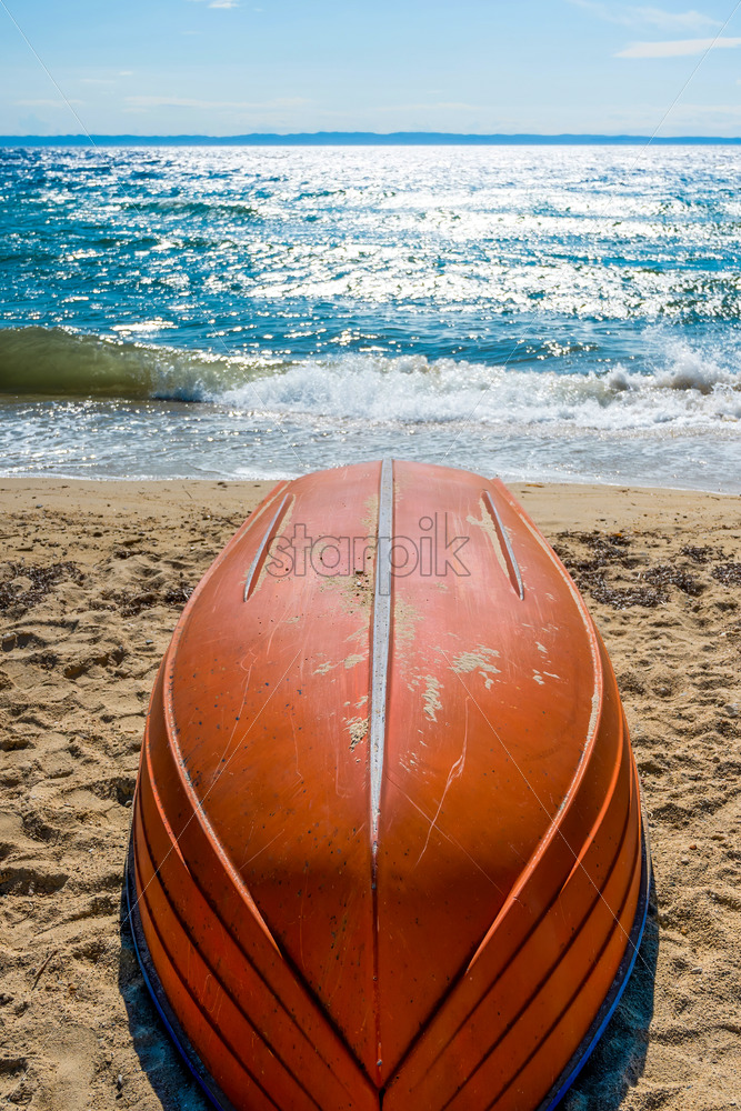 Empty sunbed and closed umbrella on the beach of the Aegean sea, land in the distance in Nikiti, Greece. Vertical shooting Royalty Free Stock Video Footage
