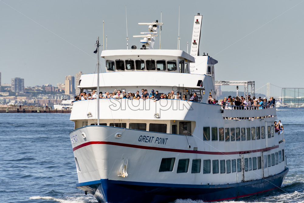 NEW YORK, USA – SEPTEMBER, 2019: Close view of a floating ferry boat full of people. Skyscrapers on the background