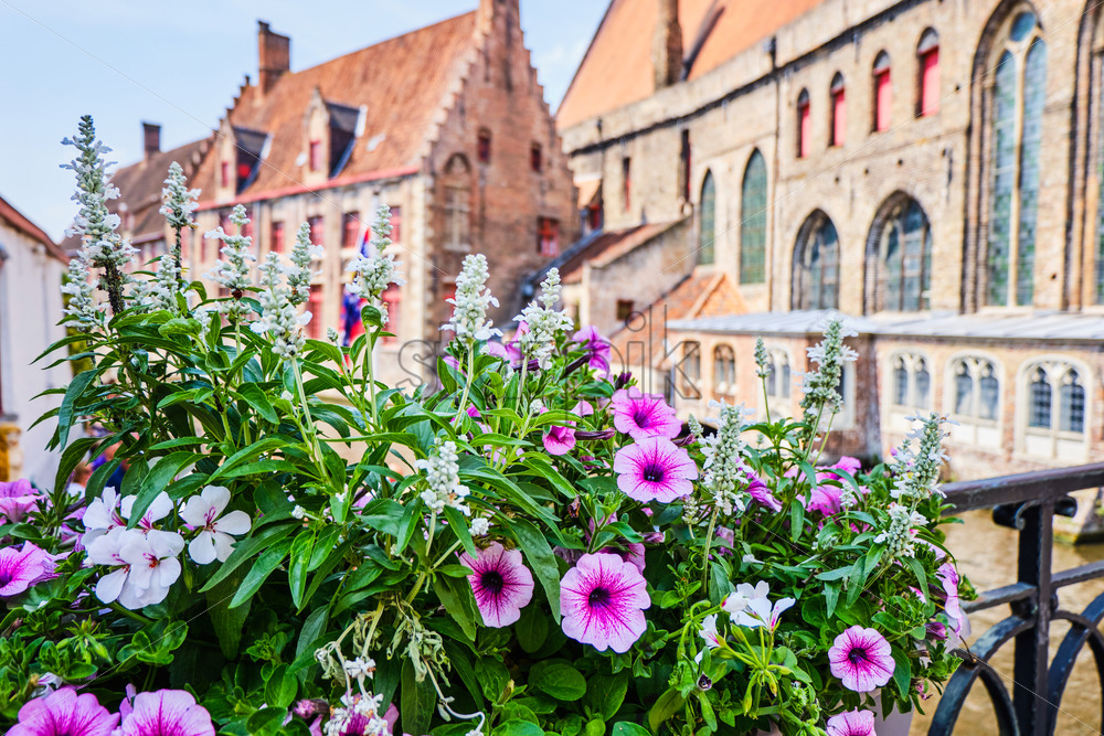 Home » Shop » buildings » Flowers above river near Belfry. Bruges, Belgium
