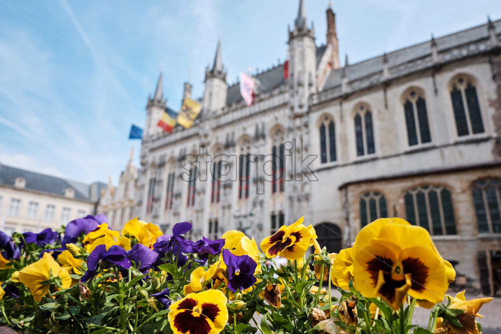 Flowers in markt square with Provincial Court on background. Bruges, Belgium