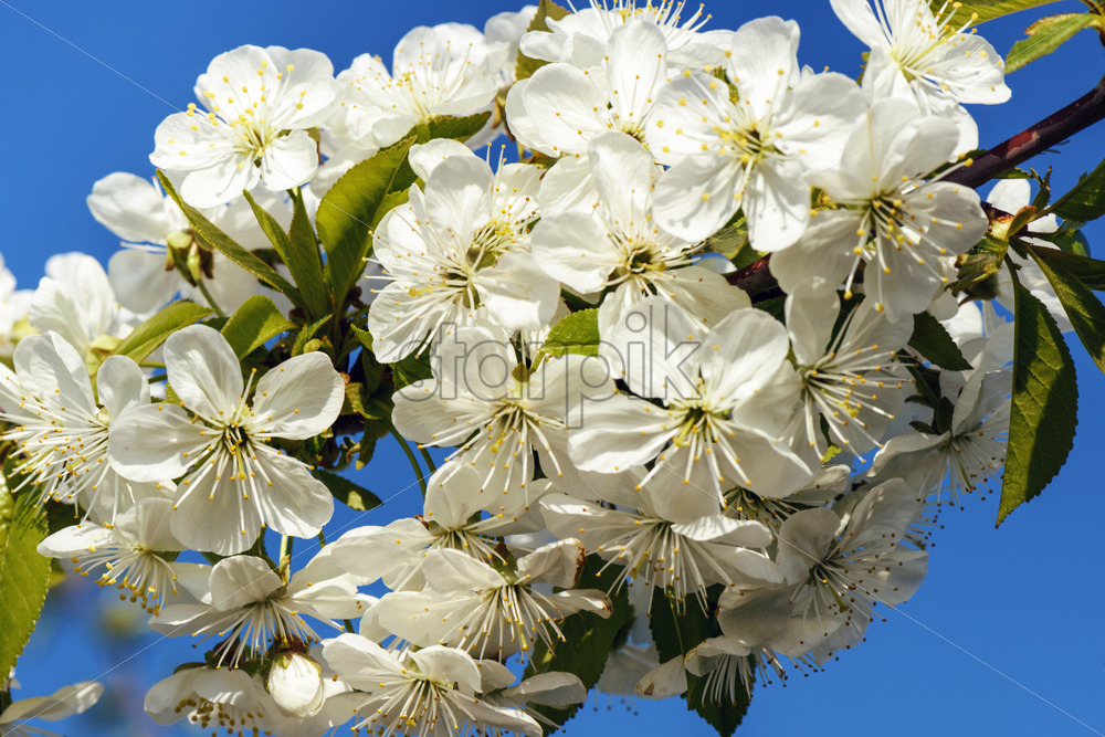 Flowers of white cherry trees on blue sky background in sunny day Royalty Free Stock photo