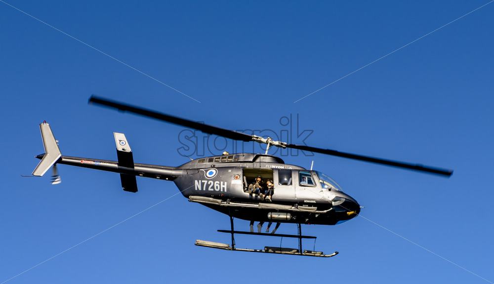 NEW YORK, USA – SEPTEMBER, 2019: Flying helicopter. Blue, clear sky on the background