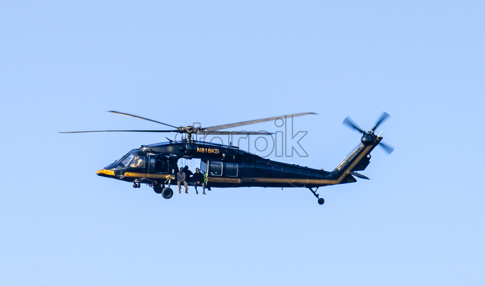 Flying helicopter in New York, USA. Blue, clear sky on the background