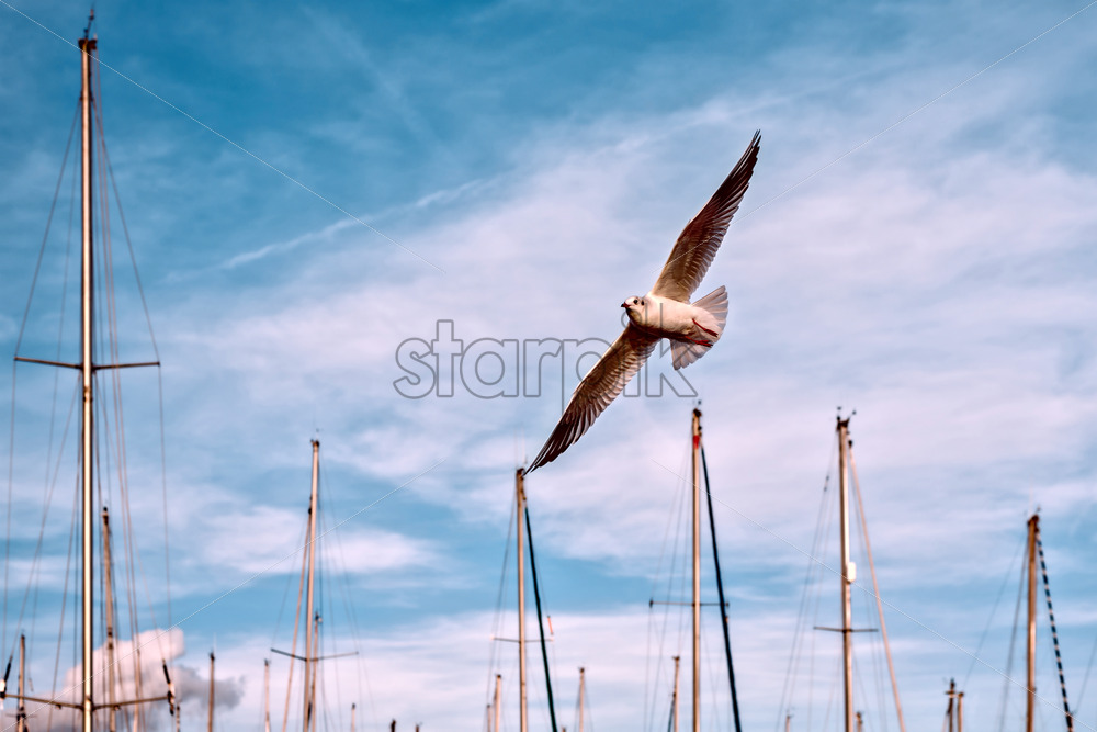 Flying seagull at sunset in the port of Barcelona, Spain Catalunya