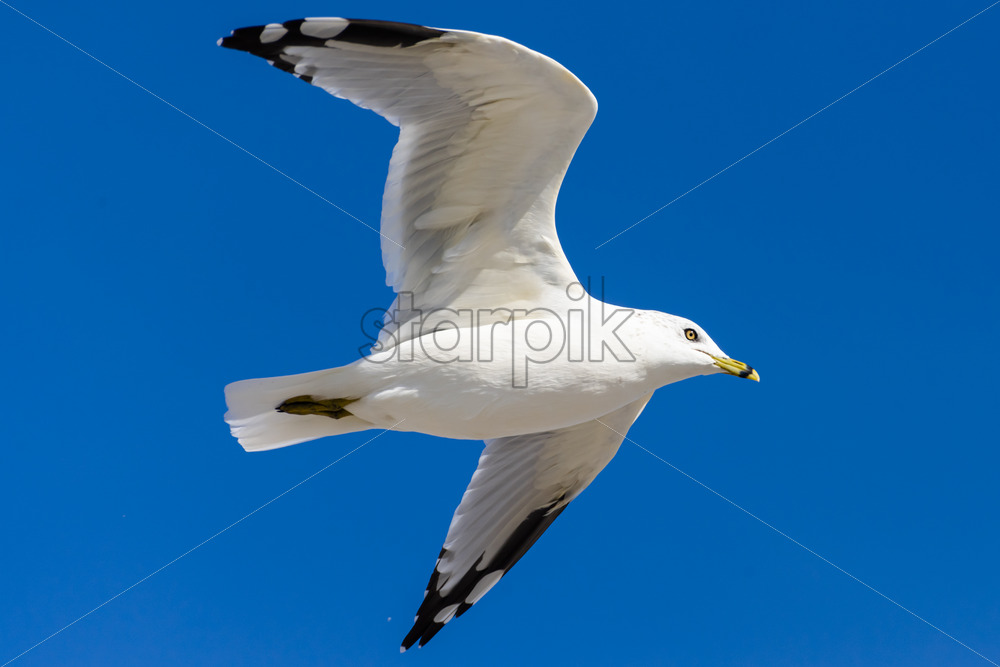 Close up of a seagull gliding through the air against a clear blue sky Royalty Free Stock Video Footage