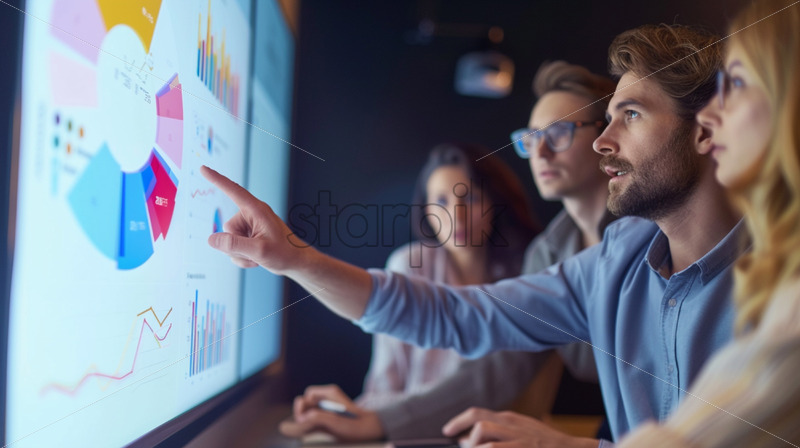 Focused team in a meeting, discussing charts and graphs on a large screen