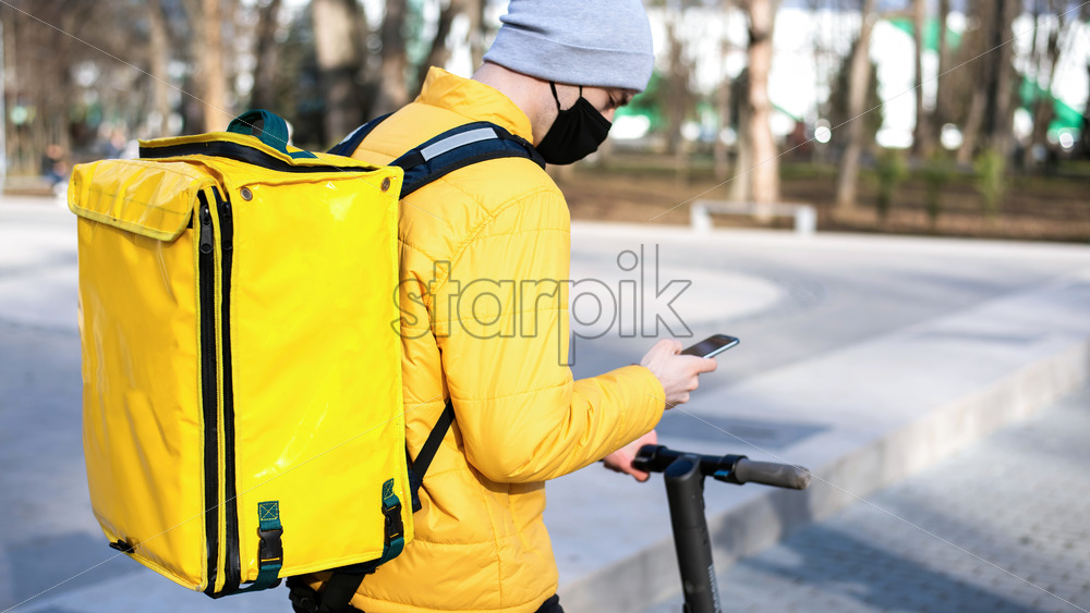 Food delivery man on a scooter in a park using his smartphone. Black medical mask, yellow backpack and jacket. Winter