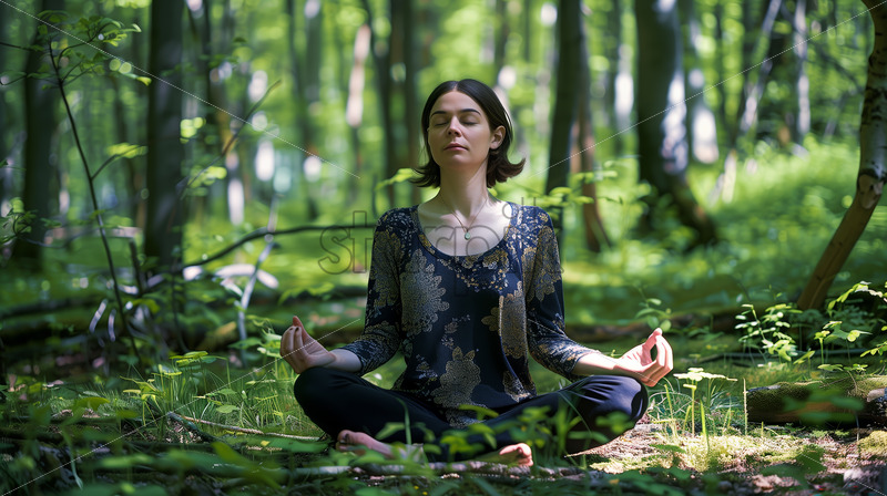 Serene meditator in lotus position connects with nature’s sounds, exuding inner calm in tranquil forest.