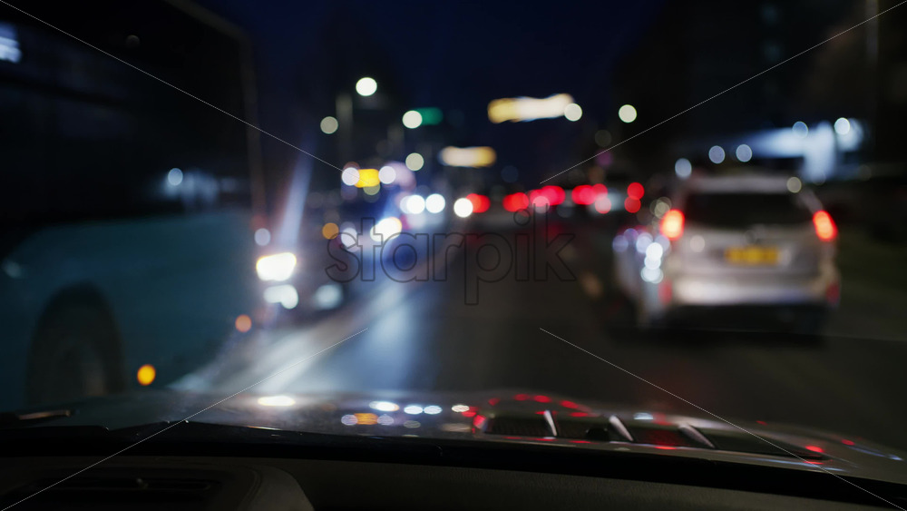 Close perspective of a car interior at night with dashboard details and windshield reflections