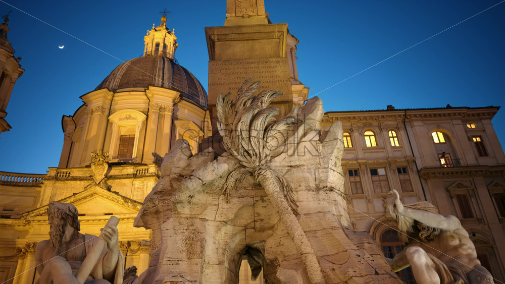 VIDEO Fountain of the Four Rivers located in Navona square. Rome city square at sunset. Italy Royalty Free Stock Video Footage