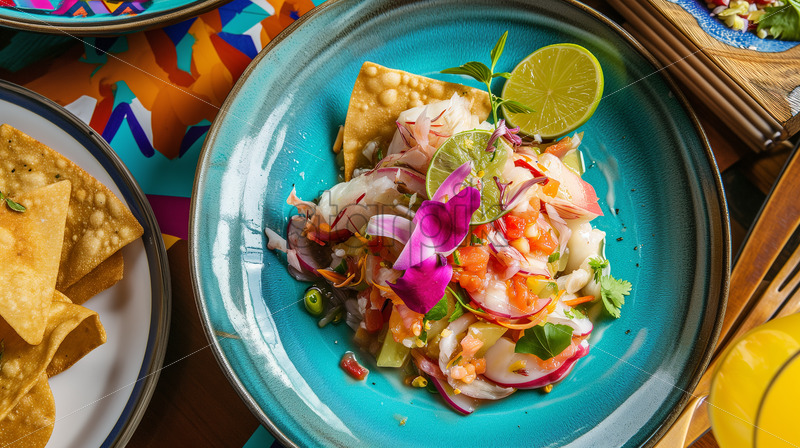 Peruvian ceviche featuring fresh fish cured in citrus juices, adorned with colorful garnishes, and served with crispy plantain chips.
