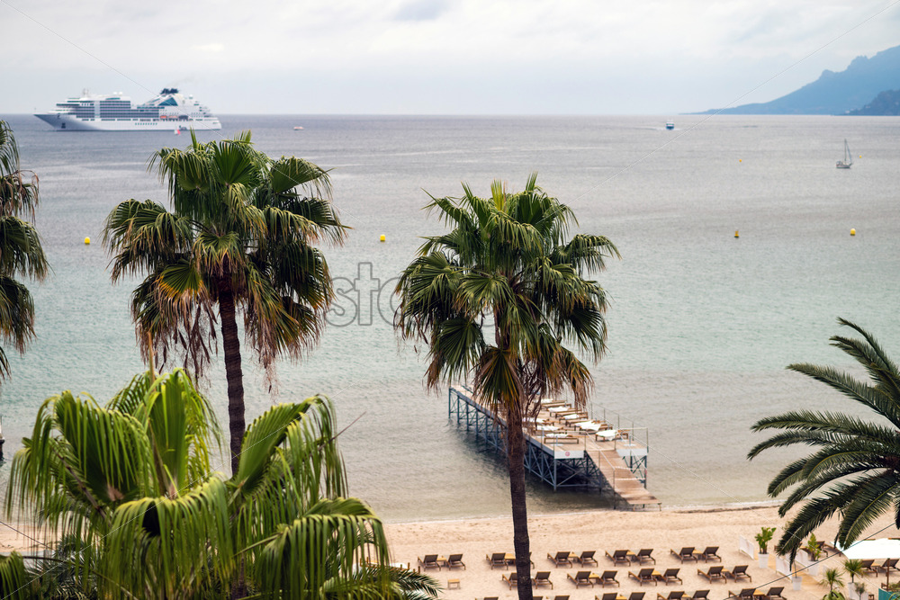 Cannes, France – October 4, 2025: Elegant view of the Carlton hotel surrounded by lush green palm trees under clear blue sky Royalty Free Stock Video Footage