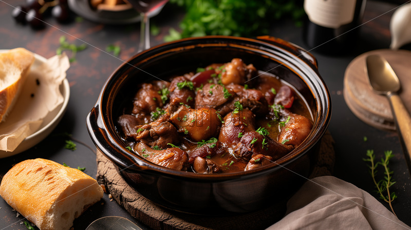 An elegant photograph showcasing French Coq au Vin, a slow-cooked chicken stew in red wine.