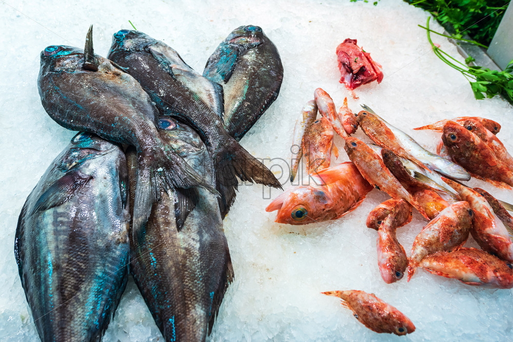 Fresh fish in ice at the market. Seafood for sell Royalty Free Stock photo