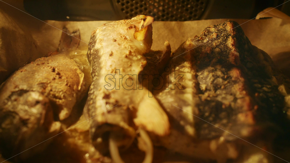 Home » Shop » 1 Video » Fresh fish pieces roasting in the oven on a tray, golden surface and steam visible.