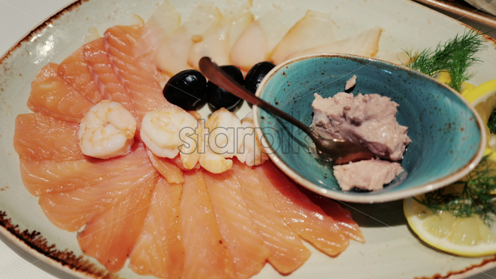 Home » Shop » 1 Video » Video – Fresh seafood platter with smoked salmon slices, shrimp, olives, and pate served with lemon and dill garnish