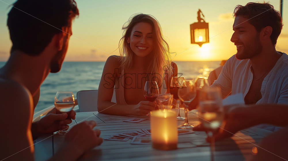 A group of friends drinking wine for a toast under a golden sunset on a luxurious yacht
