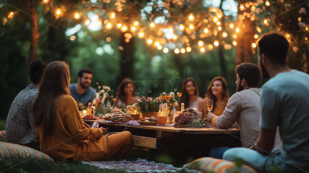 friends gathered at fire camp in the middle of the night with stars in the sky