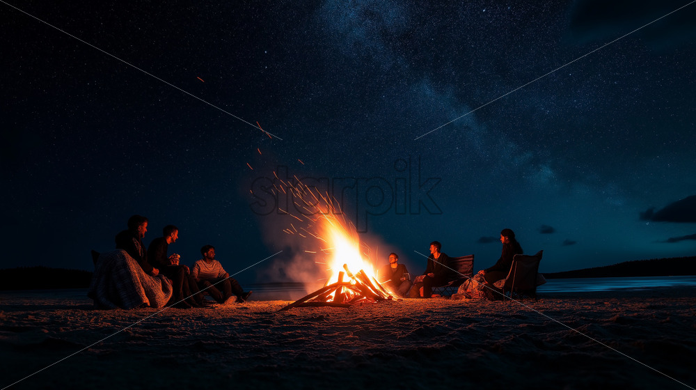 friends gathered at fire camp in the middle of the night with stars in the sky