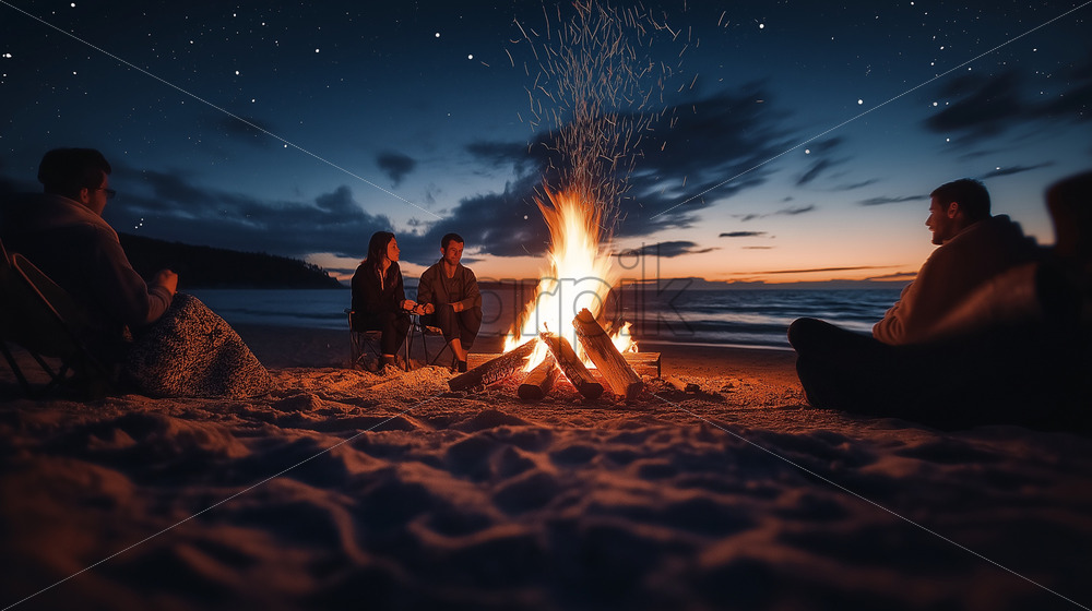 friends gathered at fire camp in the middle of the night with stars in the sky
