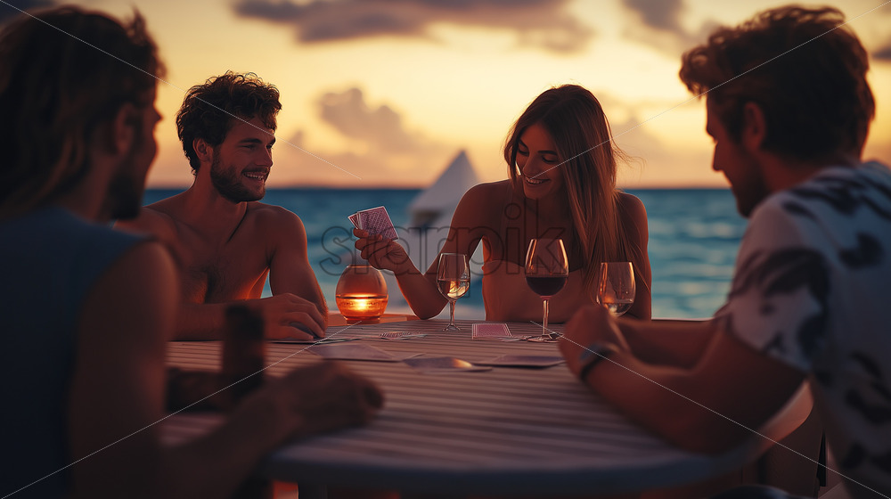 Home » Shop » AI Illustration » friends playing cards and drinking wine on a yacht