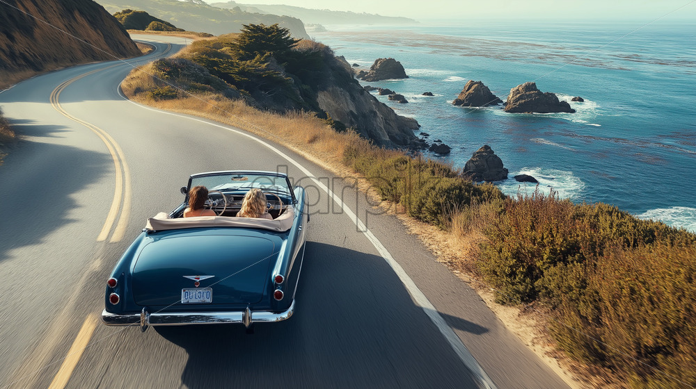 a pink car on the road voyage vintage card