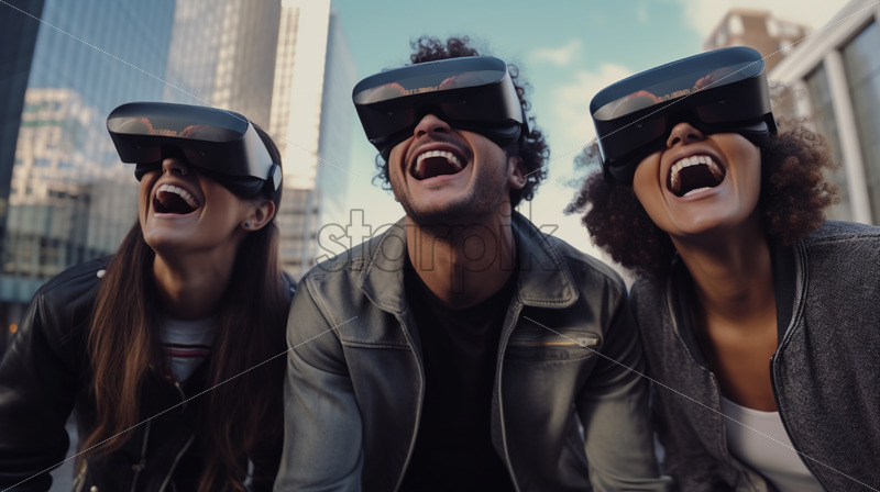 A team of young friends using virtual reality VR equipment on an arena. A girl in the center and other playmates in the background. Neon lights