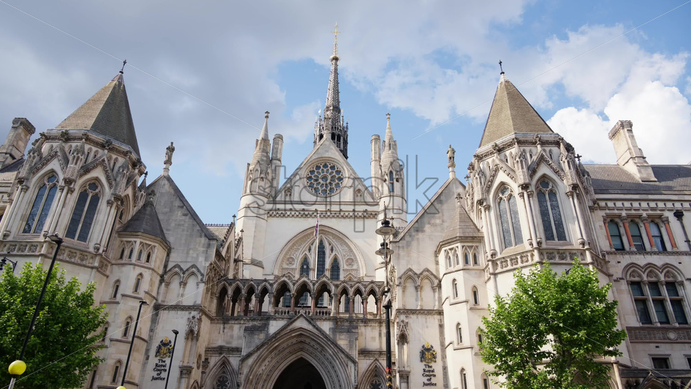 Front view of the main entrance of the Royal Courts of Justice in London, England under a clear blue sky Royalty Free Stock Video Footage
