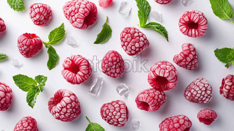 Advertising photo with ice cubes, frozen pink fruits, on a pink background