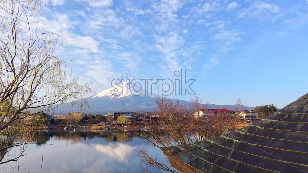 Aerial drone view of the roof of a temple in Fujikawaguchiko, Japan with Mount Fuji on the background Royalty Free Stock Video Footage