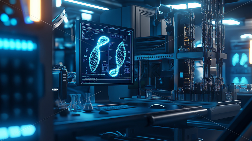 Home » Shop » AI Illustration » futuristic medical lab with a quantum computer analyzing human DNA