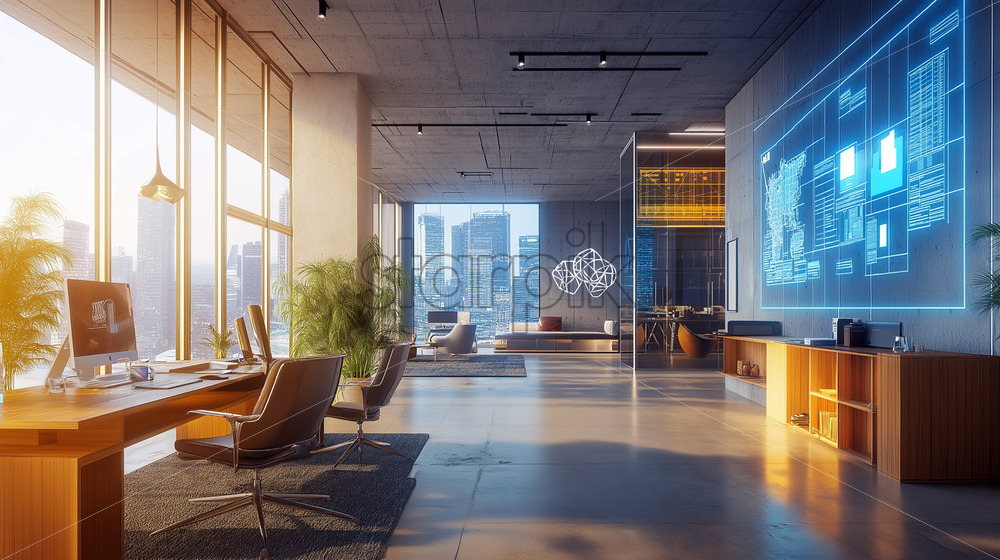 robot in a modern office, assisting with various tasks such as data analysis on a holographic screen,