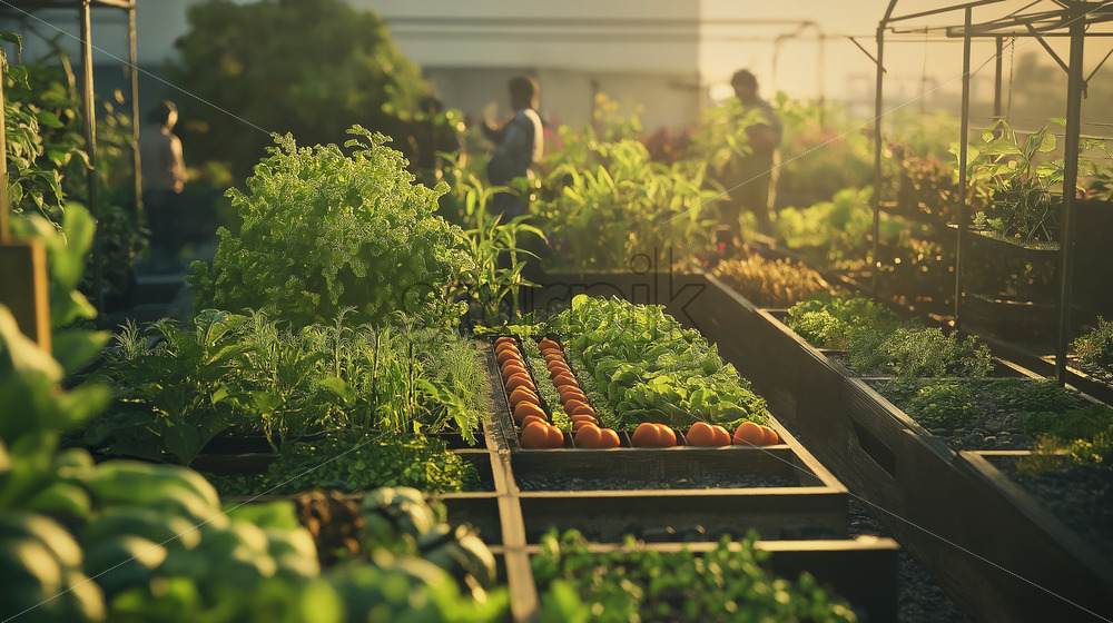 futuristic urban garden on a rooftop, with people harvesting fresh produce