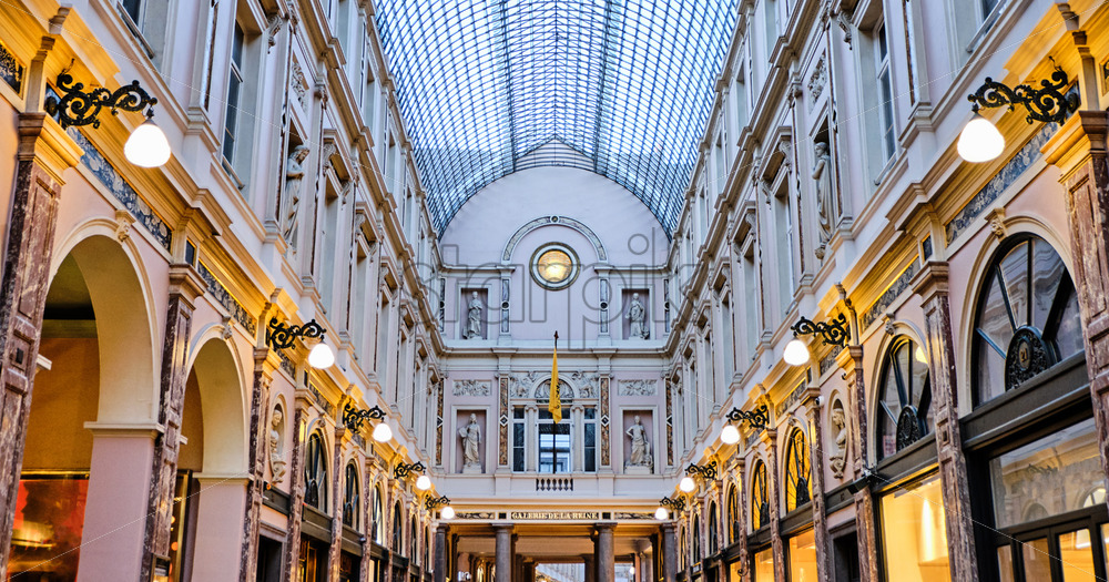Galeries Royales Saint-Hubert at sunset with warm lights glowing. Brussels, Belgium