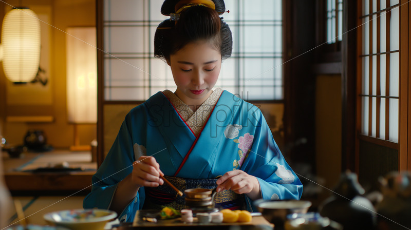 Capturing the essence of tranquility, this close-up portrait features a Geisha immersed in a traditional tea ceremony, set against the backdrop of a Tatami room with sliding doors, calligraphy, and soft ambient light from paper lanterns. The scene is adorned … Read More