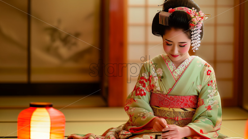 Geisha in a traditional tea ceremony, immersed in a Tatami room with sliding doors adorned with calligraphy.