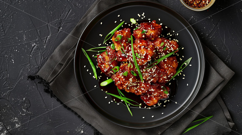 General Tso’s chicken on a sleek black plate garnished with sesame seeds and sliced scallions.
