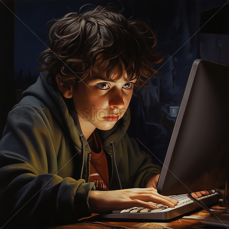 Group of multiracial teens in headsets playing video games in video game club with blue and red illumination. Keyboard and mouse with illumination