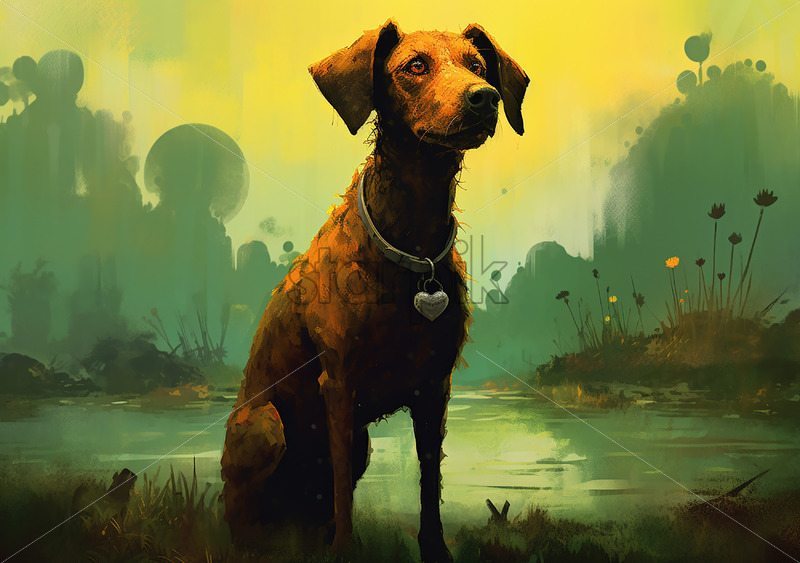 Generative AI a brown puppy with a leash around its neck on the background of a lake and a forest